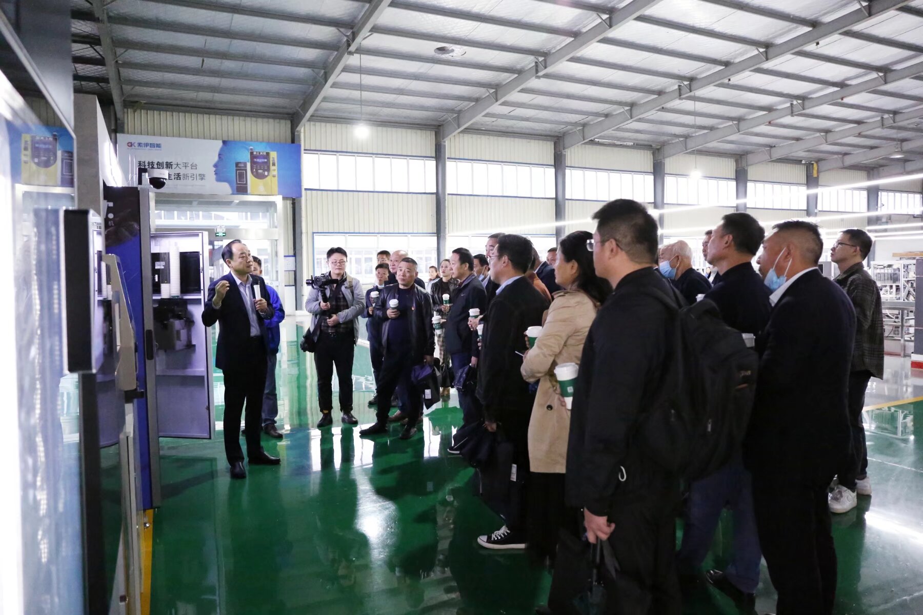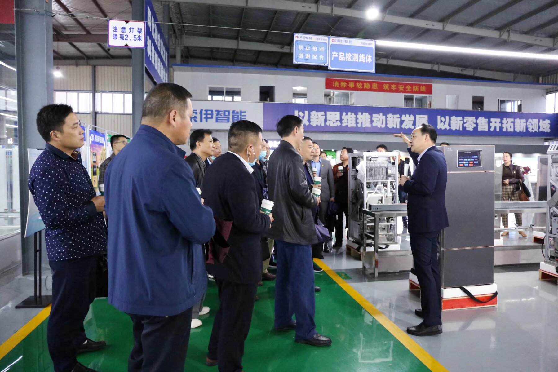 接着大家来到了智能制造车间及索伊电器产品展示厅,董事长助理倪曙东重点介绍了世界首创、中国独创的智能化数字烹饪机器人产品,以及全球领先、拥有100多项国家专利的智能化数字机器人饮料机产品,并现场解答了各位大家提出的问题。在产品展示厅,大家参观了无人售货柜、牛奶格子柜、高端冷链、生鲜自提柜等系列智能产品后不停地称赞,一致表示这些智能产品极大地提高了人们的生活品质,给生活带来了更多的便利。最后又来到索伊集团转型展示厅,王琼峰董事长介绍了企业探索升级、智能转型、蛟龙得水、蓄势腾飞的发展历程,并强调企业只有不断地通过积极探索、调研和论证,才能寻求适合自身发展的企业规划、产业道路。企业通过几年的探索,已经形成以“智慧餐厨项目工程”为核心的发展方向,以“智能化数字厨电新产品”研发、制造和应用为核心的智能化数字化产业集群。